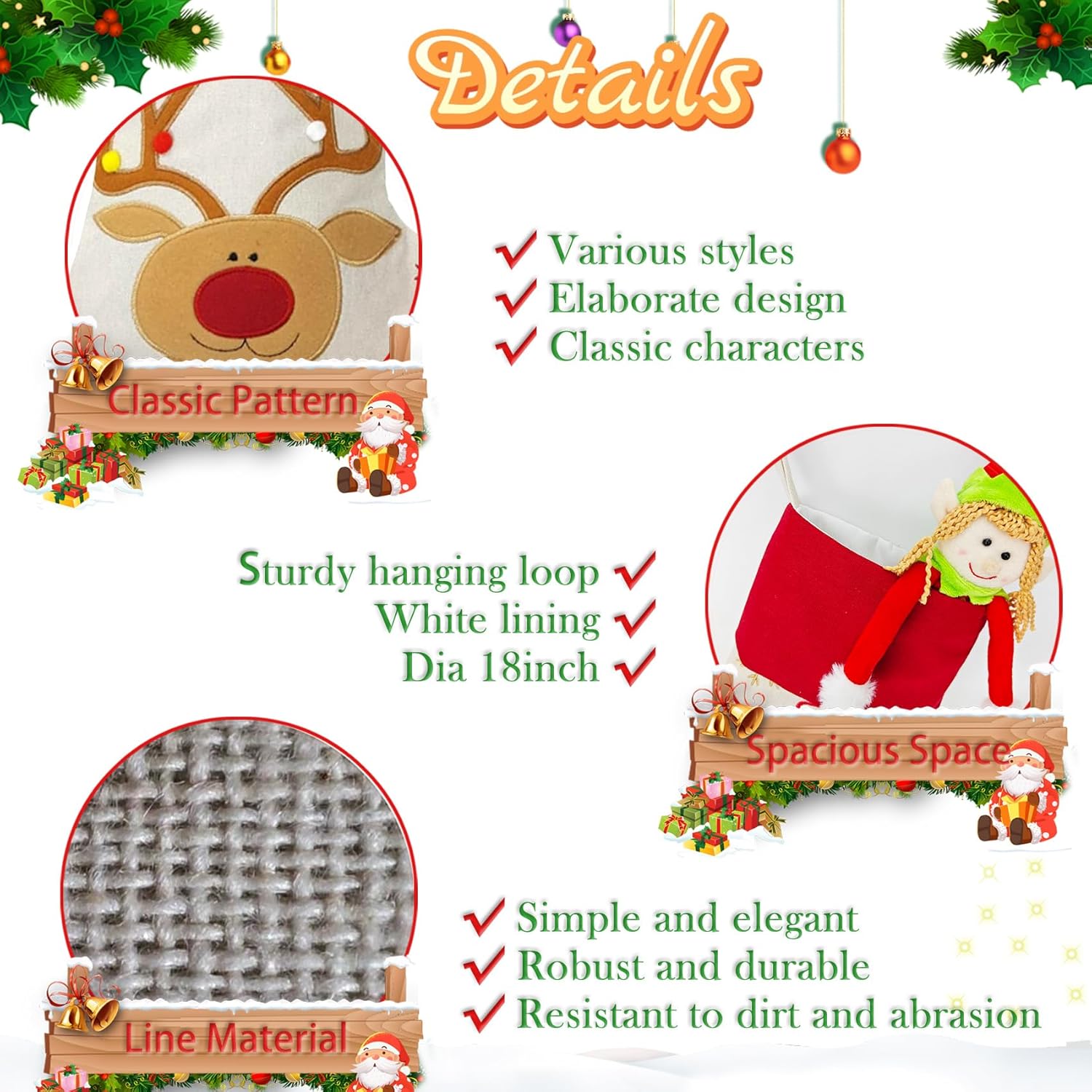 These festive Christmas stockings are the perfect addition to your holiday decor. Crafted with care, each stocking features a vibrant red background adorned with charming elf and present designs. The whimsical patterns, showcasing cheerful elves carrying gifts or peeking out from behind Christmas trees, are sure to delight both young and old. Hang these stockings by the fireplace or along the mantel to create a warm, inviting atmosphere and build anticipation for the arrival of Santa Claus. With their eye-catching designs and high-quality construction, these stockings will become cherished family heirlooms, bringing joy and merriment to your home year after year.