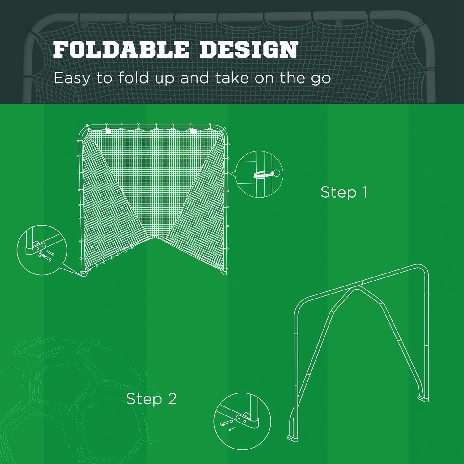 Foldable Lacrosse Goal The SwingIt lacrosse goal adopts a foldable design, which is easy to store and does not take up space. It can simply rely on the wall and can be moved at any time, perfect for backyard play. Easy Assembly The Lacrosse goal has snap-lock frame for easy assembly. No tools required, just insert the tube. High Quality Net Lacosse goals are made of 3.5mm polyester wire, which is not easy to tear and deform, durable and will not deteriorate in bad weather. Can withstand high-intensity shooting, the quality is higher than other brands. Metal Steel Frame The lacrosse goal with 17 gauge tubular steel frame for stability and features. It can be easily folded as soon as the pull tab is pulled.
